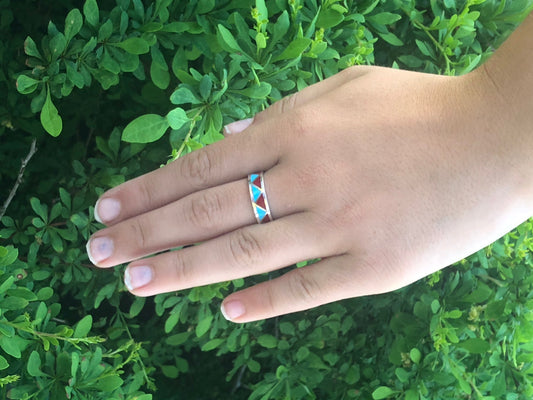 Zigzag Turquoise and Coral Navajo inlay ring